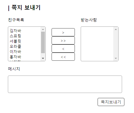 <%@ page contentType="text/html; charset=UTF-8"%> <%@ page trimDirectiveWhitespaces="true" %> <!DOCTYPE html> <html> <head> <meta charset="UTF-8"> <title>Insert title here</title> <link rel="icon" href="data:;base64,iVBORw0KGgo="> <style type="text/css"> * { margin: 0; padding: 0; box-sizing: border-box; } body { font-size: 14px; font-family: "맑은 고딕", 나눔고딕, 돋움, sans-serif; } a { color: #000; text-decoration: none; cursor: pointer; } a:active, a:hover { text-decoration: underline; color: #F28011; } .btn { color: #333; border: 1px solid #333; background-color: #fff; padding: 4px 10px; border-radius: 4px; font-weight: 500; cursor:pointer; font-size: 14px; font-family: "맑은 고딕", 나눔고딕, 돋움, sans-serif; vertical-align: baseline; } .btn:hover, .btn:active, .btn:focus { background-color: #e6e6e6; border-color: #adadad; color:#333; } .boxTF { border: 1px solid #999; padding: 5px 5px; background-color: #fff; border-radius: 4px; font-family: "맑은 고딕", 나눔고딕, 돋움, sans-serif; vertical-align: baseline; } .selectField { border: 1px solid #999; padding: 4px 5px; border-radius: 4px; font-family: "맑은 고딕", 나눔고딕, 돋움, sans-serif; vertical-align: baseline; } .boxTA { border:1px solid #999; height:150px; padding:3px 5px; border-radius:4px; background-color:#fff; resize : none; vertical-align: baseline; } textarea:focus, input:focus { outline: none; } .title { width:100%; font-size: 16px; font-weight: bold; padding: 13px 0; } .container { width: 400px; margin: 30px auto; } .note-table { width: 100%; border-spacing: 0; border-collapse: collapse; } .note-table th, .note-table td { padding: 7px 0; } .left { text-align: left; padding-left: 7px; } .center { text-align: center; } .right { text-align: right; padding-right: 7px; } </style> <script type="text/javascript"> function itemAdd() { var f = document.noteForm; var item = f.itemLeft; item[item.length] = new Option("김자바", "kim"); // text, value item[item.length] = new Option("스프링", "spring"); item[item.length] = new Option("서블릿", "servlet"); item[item.length] = new Option("오라클", "oracle"); item[item.length] = new Option("이자바", "lee"); item[item.length] = new Option("홍자바", "hong"); item[item.length] = new Option("나대한", "na"); } window.onload = () => itemAdd(); // 선택된 option을 좌 또는 우로 이동 function itemMove(pos) { var f = document.noteForm; var source, target; if(pos==="left") { // right -> left source = f.itemRight; target = f.itemLeft; } else { // left -> right source = f.itemLeft; target = f.itemRight; } var len = source.length; for(var i=0; i<len; i++) { if( source.options[i].selected ) { // 선택된 항목만 target[target.length] = new Option(source.options[i].text, source.options[i].value); source[i] = null; // 삭제 i--; len--; } } } // 모든 option을 좌 또는 우로 이동 function itemAllMove(pos) { var f = document.noteForm; var source, target; if(pos==="left") { // right -> left source = f.itemRight; target = f.itemLeft; } else { // left -> right source = f.itemLeft; target = f.itemRight; } var len = source.length; for(var i=0; i<len; i++) { target[target.length] = new Option(source.options[0].text, source.options[0].value); source[0] = null; // 삭제 } } function sendOk() { var f = document.noteForm; if( f.itemRight.length === 0 ) { alert("받는 사람을 먼저 추가 하세요..."); f.itemRight.focus(); return; } if(! f.msg.value.trim() ) { alert("메시지를 입력하세요..."); f.msg.focus(); return; } // select 요소는 서버로 전송하기 위해서 반드시 항목들이 선택되어 있어야 한다. for(var i=0; i < f.itemRight.length; i++) { f.itemRight[i].selected = true; // select 항목 선택 } f.action = "note_ok.jsp"; f.submit(); } </script> </head> <body> <div class="container"> <div class="title"> <h3><span>|</span> 쪽지 보내기</h3> </div> <form name="noteForm" method="post"> <table class="note-table"> <tr> <td width="150"><span>친구목록</span></td> <td width="100"> </td> <td width="150"><span>받는사람</span></td> </tr> <tr> <td class="left"> <select name="itemLeft" multiple="multiple" class="selectField" style="width:130px; height:120px;"></select> </td> <td class="center"> <button type="button" class="btn" onclick="itemMove('right');" style="display:block; width:80px;"> > </button> <button type="button" class="btn" onclick="itemAllMove('right');" style="display:block;width:80px;"> >> </button> <button type="button" class="btn" onclick="itemMove('left');" style="display:block;width:80px;"> < </button> <button type="button" class="btn" onclick="itemAllMove('left');" style="display:block;width:80px;"> << </button> </td> <td class="left"> <select name="itemRight" multiple="multiple" class="selectField" style="width:130px; height:120px;"> </select> </td> </tr> <tr> <td colspan="3"> <span>메시지</span> </td> </tr> <tr> <td colspan="3" class="left"> <textarea name="msg" class="boxTA" style="height:60px; width: 98%;"></textarea> </td> </tr> </table> <table class="note-table"> <tr> <td class="right"> <button type="button" class="btn" onclick="sendOk();"> 쪽지보내기 </button> </td> </tr> </table> </form> </div> </body> </html><%@ page contentType="text/html; charset=UTF-8"%> <%@ page trimDirectiveWhitespaces="true" %> <% request.setCharacterEncoding("utf-8"); String[] ss = request.getParameterValues("itemRight"); String receiver = ""; if(ss != null) { for(String s : ss) { receiver += s + ", "; } } String msg = request.getParameter("msg"); %> <!DOCTYPE html> <html> <head> <meta charset="UTF-8"> <title>Insert title here</title> <link rel="icon" href="data:;base64,iVBORw0KGgo="> </head> <body> <p> 받는 사람 : <%= receiver %> <p> 메시지 ...</p> <div style="white-space: pre;"><%=msg%></div> </body> </html>