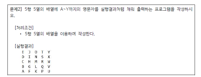 package ex0712; public class Ex19_Q2 { public static void main(String[] args) { // 예제 문제2 char[][] c = new char[5][5]; char n = 'A'; for(int i=0; i<5; i++) { for(int j=4; j>=0; j--) { c[j][i] = n++; } } for(int i=0; i<c.length; i++) { for(int j=0; j<c[i].length; j++) { System.out.printf("%3c", c[i][j]); } System.out.println(); } } }반응형'프로그래밍 > JAVA 자바' 카테고리의 다른 글