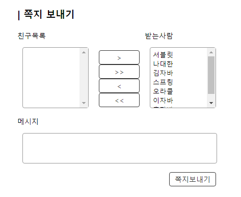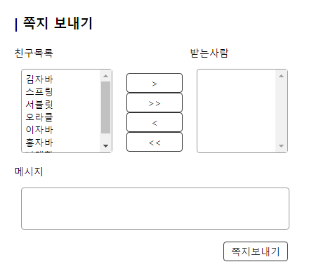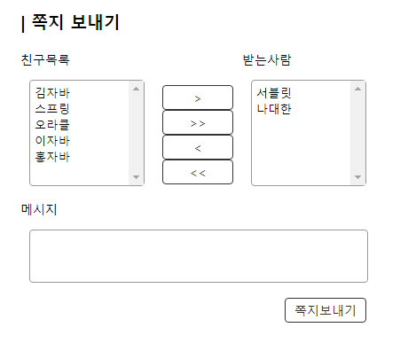 <!DOCTYPE html> <html> <head> <meta charset="UTF-8"> <title>Insert title here</title> <link rel="icon" href="data:;base64,iVBORw0KGgo="> <style type="text/css"> * { margin: 0; padding: 0; box-sizing: border-box; } body { font-size: 14px; font-family: "맑은 고딕", 나눔고딕, 돋움, sans-serif; } a { color: #000; text-decoration: none; cursor: pointer; } a:active, a:hover { text-decoration: underline; color: #F28011; } .btn { color: #333; border: 1px solid #333; background-color: #fff; padding: 4px 10px; border-radius: 4px; font-weight: 500; cursor:pointer; font-size: 14px; font-family: "맑은 고딕", 나눔고딕, 돋움, sans-serif; vertical-align: baseline; } .btn:hover, .btn:active, .btn:focus { background-color: #e6e6e6; border-color: #adadad; color:#333; } .boxTF { border: 1px solid #999; padding: 5px 5px; background-color: #fff; border-radius: 4px; font-family: "맑은 고딕", 나눔고딕, 돋움, sans-serif; vertical-align: baseline; } .selectField { border: 1px solid #999; padding: 4px 5px; border-radius: 4px; font-family: "맑은 고딕", 나눔고딕, 돋움, sans-serif; vertical-align: baseline; } .boxTA { border:1px solid #999; height:150px; padding:3px 5px; border-radius:4px; background-color:#fff; resize : none; vertical-align: baseline; } textarea:focus, input:focus { outline: none; } .title { width:100%; font-size: 16px; font-weight: bold; padding: 13px 0; } .container { width: 400px; margin: 30px auto; } .table { width: 100%; border-spacing: 0; border-collapse: collapse; } .table th, .table td { padding: 7px 0; } .table-border tr { border-bottom: 1px solid #ccc; } .table-border tr:first-child { border-top: 2px solid #ccc; } </style> <script type="text/javascript"> function itemAdd() { var f = document.noteForm; var item = f.itemLeft; // select 요쇼에 option 요소 추가 item[item.length] = new Option("김자바", "kim"); // text, value item[item.length] = new Option("스프링", "spring"); item[item.length] = new Option("서블릿", "servlet"); item[item.length] = new Option("오라클", "oracle"); item[item.length] = new Option("이자바", "lee"); item[item.length] = new Option("홍자바", "hong"); item[item.length] = new Option("나대한", "na"); } window.onload = () => itemAdd(); // 선택된 option을 좌 또는 우로 이동 function itemMove(pos) { var f = document.noteForm; var source, target; if(pos==="left") { // right -> left source = f.itemRight; target = f.itemLeft; } else { // left -> right source = f.itemLeft; target = f.itemRight; } var len = source.length; for(var i=0; i<len; i++) { if( source.options[i].selected ) { // 선택된 항목만 target[target.length] = new Option(source.options[i].text, source.options[i].value); source[i] = null; // 삭제 i--; len--; } } } // 모든 option을 좌 또는 우로 이동 function itemAllMove(pos) { var f = document.noteForm; var source, target; if(pos==="left") { // right -> left source = f.itemRight; target = f.itemLeft; } else { // left -> right source = f.itemLeft; target = f.itemRight; } var len = source.length; for(var i=0; i<len; i++) { target[target.length] = new Option(source.options[0].text, source.options[0].value); source[0] = null; // 삭제 } } function sendOk() { var f = document.noteForm; if( f.itemRight.length === 0 ) { alert("받는 사람을 먼저 추가 하세요..."); f.itemRight.focus(); return; } if(! f.msg.value.trim() ) { alert("메시지를 입력하세요..."); f.msg.focus(); return; } // select 요소는 서버로 전송하기 위해서 반드시 항목들이 선택되어 있어야 한다. for(var i=0; i < f.itemRight.length; i++) { f.itemRight[i].selected = true; // select 항목 선택 } alert("메시지 전송..."); } </script> </head> <body> <div class="container"> <div class="title"> <h3><span>|</span> 쪽지 보내기</h3> </div> <form name="noteForm" method="post"> <table class="table"> <tr> <td width="150"><span>친구목록</span></td> <td width="100"> </td> <td width="150"><span>받는사람</span></td> </tr> <tr> <td style="padding-left: 10px;"> <select name="itemLeft" multiple="multiple" class="selectField" style="width:130px; height:120px;"></select> </td> <td align="center"> <button type="button" class="btn" onclick="itemMove('right');" style="display:block; width:80px;"> > </button> <button type="button" class="btn" onclick="itemAllMove('right');" style="display:block;width:80px;"> >> </button> <button type="button" class="btn" onclick="itemMove('left');" style="display:block;width:80px;"> < </button> <button type="button" class="btn" onclick="itemAllMove('left');" style="display:block;width:80px;"> << </button> </td> <td style="padding-left: 10px;"> <select name="itemRight" multiple="multiple" class="selectField" style="width:130px; height:120px;"> </select> </td> </tr> <tr> <td colspan="3"> <span>메시지</span> </td> </tr> <tr> <td colspan="3" style="padding-left: 10px;"> <textarea name="msg" class="boxTA" style="height:60px; width: 98%;"></textarea> </td> </tr> </table> <table class="table"> <tr> <td align="right" style="padding-right: 10px;"> <button type="button" class="btn" onclick="sendOk();"> 쪽지보내기 </button> </td> </tr> </table> </form> </div> </body> </html>