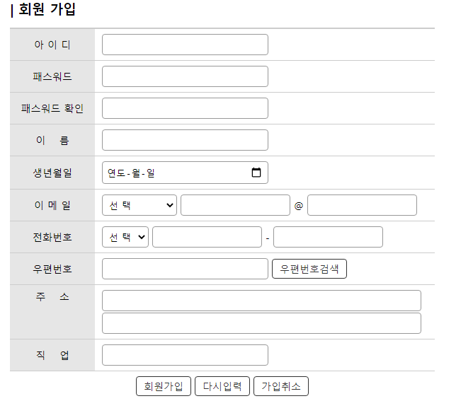 입력창들은 전부 자바스크립트에서 정규식으로 검토를 하는 모습이고
