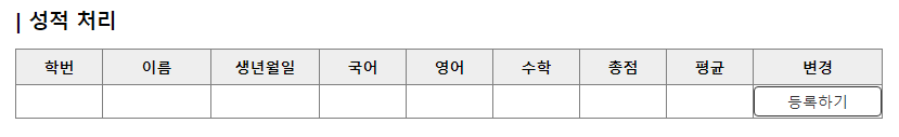 <!DOCTYPE html> <html> <head> <meta charset="UTF-8"> <title>Insert title here</title> <link rel="icon" href="data:;base64,iVBORw0KGgo="> <style type="text/css"> * { margin: 0; padding: 0; box-sizing: border-box; } body { font-size: 14px; font-family: "맑은 고딕", 나눔고딕, 돋움, sans-serif; } a { color: #000; text-decoration: none; cursor: pointer; } a:active, a:hover { text-decoration: underline; color: #F28011; } .btn { color: #333; border: 1px solid #333; background-color: #fff; padding: 4px 10px; border-radius: 4px; font-weight: 500; cursor:pointer; font-size: 14px; font-family: "맑은 고딕", 나눔고딕, 돋움, sans-serif; vertical-align: baseline; } .btn:hover, .btn:active, .btn:focus { background-color: #e6e6e6; border-color: #adadad; color:#333; } .boxTF { border: 1px solid #999; padding: 5px 5px; background-color: #fff; border-radius: 4px; font-family: "맑은 고딕", 나눔고딕, 돋움, sans-serif; vertical-align: baseline; } .selectField { border: 1px solid #999; padding: 4px 5px; border-radius: 4px; font-family: "맑은 고딕", 나눔고딕, 돋움, sans-serif; vertical-align: baseline; } textarea:focus, input:focus { outline: none; } .title { width:100%; font-size: 16px; font-weight: bold; padding: 13px 0; } .container { width: 800px; margin: 30px auto; } .table { width: 100%; border-spacing: 0; border-collapse: collapse; } .table tr th { padding: 7px 0; background: #eee; } #tbScore input { /* border:1px solid #999; */ border: none; padding:5px 5px; width:100%; height: 30px; } #tbScore span { cursor: pointer; } tr.over {background: #f5fffa;} </style> <script type="text/javascript"> function isValidDateFormat(data){ var regexp = /[12][0-9]{3}[\.|\-|\/]?[0-9]{2}[\.|\-|\/]?[0-9]{2}/; if(! regexp.test(data)) return false; regexp=/(\.)|(\-)|(\/)/g; data=data.replace(regexp, ""); var y=parseInt(data.substr(0, 4)); var m=parseInt(data.substr(4, 2)); if(m<1||m>12) return false; var d=parseInt(data.substr(6)); var lastDay = (new Date(y, m, 0)).getDate(); if(d<1||d>lastDay) return false; return true; } function isValidNumberFormat(data){ var format=/^(\d+)$/; return format.test(data); } function isValidScoreFormat(data){ if(! isValidNumberFormat(data)) { return false; } if(parseInt(data)<0||parseInt(data)>100) { return false; } return true; } function init() { // 이벤트 등록 var inputForm = document.getElementById('inputForm'); var inputs = inputForm.getElementsByTagName('input'); for (var i = 0; i < 6 /*inputs.length*/; i++ ) { inputs[i].onkeypress = function(){ fnReturn('inputForm'); }; inputs[i].onkeyup = function(){ fnKeyup('inputForm'); }; } } function fnReturn(id) { var inputForm = document.getElementById(id); var inputs = inputForm.getElementsByTagName('input'); var obj; // 이벤트를 발생시킨 객체 if (event.srcElement) obj = event.srcElement; else if (event.target) obj = event.target; if (event.keyCode == 13) { for (var i = 0; i < inputs.length; i++ ) { if(i<5 && obj==inputs[i]) { inputs[i+1].focus(); break; } else if(i==5 && obj==inputs[i]) { if(id=="inputForm") insertScore(); else updateOk(id); break; } } } } function fnKeyup(id) { var inputForm = document.getElementById(id); var inputs = inputForm.getElementsByTagName('input'); var obj; if (event.srcElement) obj = event.srcElement; else if (event.target) obj = event.target; var idx = 0; for (var i = 0; i < inputs.length; i++ ) { if(obj==inputs[i]) { idx = i; break; } } if(idx>=3 && idx<=5) { var kor=inputs[3].value.trim(); var eng=inputs[4].value.trim(); var mat=inputs[5].value.trim(); var k = isValidScoreFormat(kor) ? parseInt(kor):0; var e = isValidScoreFormat(eng) ? parseInt(eng):0; var m = isValidScoreFormat(mat) ? parseInt(mat):0; var tot=k+e+m; var ave=Math.floor(tot/3); if(!kor && !eng && !mat) { tot=""; ave=""; } inputs[6].value = tot; inputs[7].value = ave; } } window.addEventListener('load', function() { init(); }, false); function check(id) { var inputForm = document.getElementById(id); var inputs = inputForm.getElementsByTagName('input'); var s; for (var i = 0; i < inputs.length; i++ ) { s=inputs[i].value.trim(); if(! s) { alert("값을 입력 하세요."); inputs[i].focus(); return false; } if(i==2 && !isValidDateFormat(s)) { alert("날짜의 형식이 잘못 되었습니다."); inputs[i].focus(); return false; } if(i>=3 && i<=5 && (! isValidScoreFormat(s))) { alert("점수를 정확히 입력 하세요."); inputs[i].focus(); return false; } } return true; } var nID=1; function insertScore() { if(! check('inputForm')) { return; } var inputForm = document.getElementById('inputForm'); var inputs = inputForm.getElementsByTagName('input'); var tbScore = document.getElementById('tbScore'); var tr = tbScore.getElementsByTagName('tr'); if(tr.length==1) { nID=1; } nID++; var id="row"+nID; var row, cell, span; var tot, ave, s; row=document.createElement("tr"); row.setAttribute("id", id); row.setAttribute("height", "30"); row.setAttribute("align", "center"); row.onmouseover=function() {this.setAttribute("class", "over");}; row.onmouseout=function() {this.removeAttribute("class");}; // 학번, 이름, 생년월일, 국어, 영어, 수학 tot=0; for(var i=0; i<6; i++) { s=inputs[i].value.trim(); cell=document.createElement("td"); cell.appendChild(document.createTextNode(s)); row.appendChild(cell); if(i>=3&&i<=5) { tot += parseInt(s); } inputs[i].value=""; } ave=Math.floor(tot/3); inputs[6].value=""; inputs[7].value=""; inputs[0].focus(); cell=document.createElement("td"); cell.appendChild(document.createTextNode(tot)); row.appendChild(cell); cell=document.createElement("td"); cell.appendChild(document.createTextNode(ave)); row.appendChild(cell); cell=document.createElement("td"); span=document.createElement("span"); span.appendChild(document.createTextNode("수정")); span.onclick=function() { updateScore(id); }; // span.setAttribute("style", "cursor:pointer;"); cell.appendChild(span); cell.appendChild(document.createTextNode(" | ")); span=document.createElement("span"); span.appendChild(doc