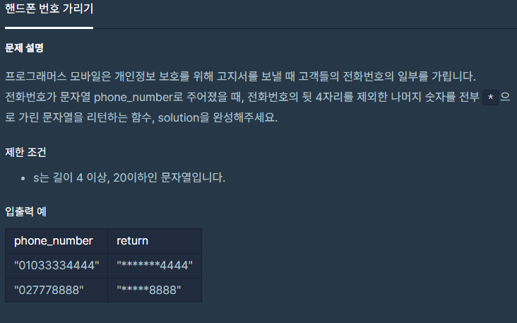 def solution(phone_number): answerLen = len(phone_number) answer1 = len(phone_number[0:answerLen-4]) answer2 = phone_number[-4:] answer = answer1 * "*" + answer2 return answer문자열 자르기와 문자열 합치기만 할 줄 안다면 쉬웠던 문제