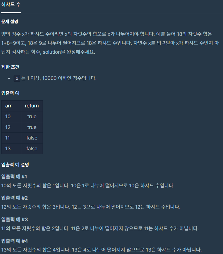 def solution(x): answer_sum = sum(map(int, str(x))) # if x % answer_sum == 0: # answer = True # else: # answer = False answer = True if x % answer_sum == 0 else False return answer solution(10)하샤드 수를 구하기 위해서 내가 알아야 하는 2개의 값은
