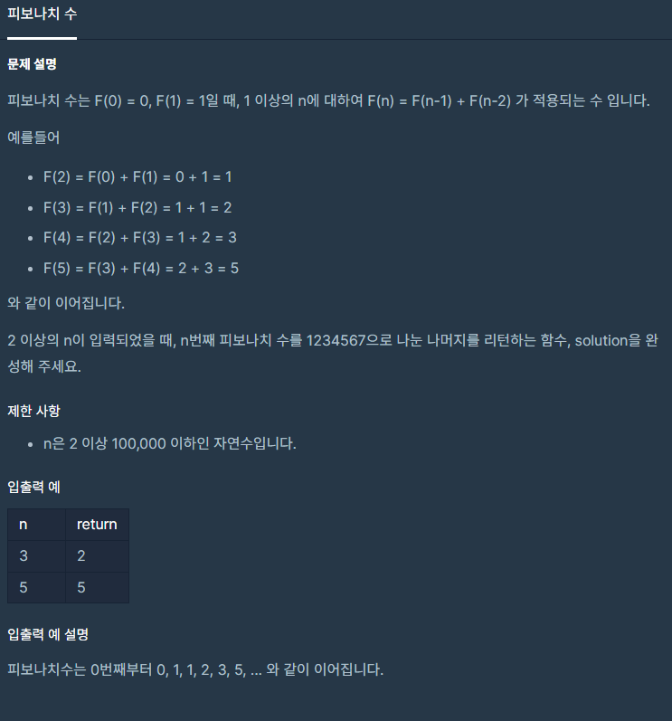 class Solution { public int solution(int n) { int answer = 0; int a = 1; int b = 1; if(n == 1 || n == 2) { return 1; } for(int i=3; i<=n; i++) { answer = (a+b) % 1234567; a = b; b = answer; } return answer; } }이건 피보나치 수가 0 1 1 2 3 이런식으로 다음 수를 구하는 방법으로 구하는 코드