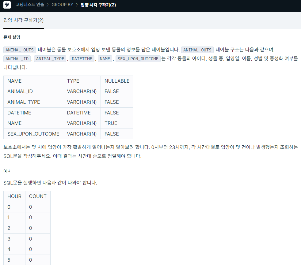 WITH RECURSIVE re AS ( select 0 as hour union all select hour + 1 from re where hour < 23 ) select re.hour, count(hour(ao.datetime)) FROM re left join ANIMAL_OUTS as ao ON re.hour = hour(ao.datetime) group by re.hour;