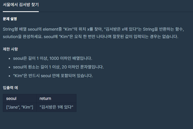 public String findKim(String[] seoul){ //x에 김서방의 위치를 저장하세요. int x = Arrays.asList(seoul).indexOf("Kim"); return "김서방은 "+ x + "에 있다"; }