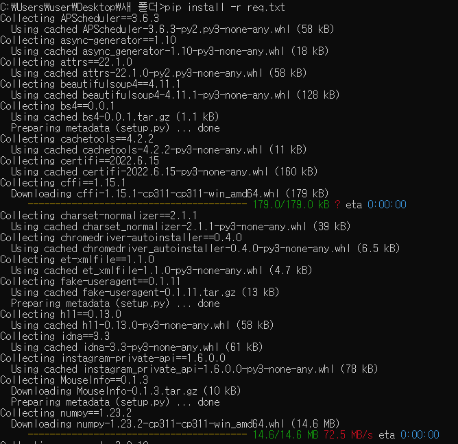 그리고 이제 백업해놨던 텍스트 파일을 가지고 pip 패키지 라이브러리들을 다시 설치한다.
