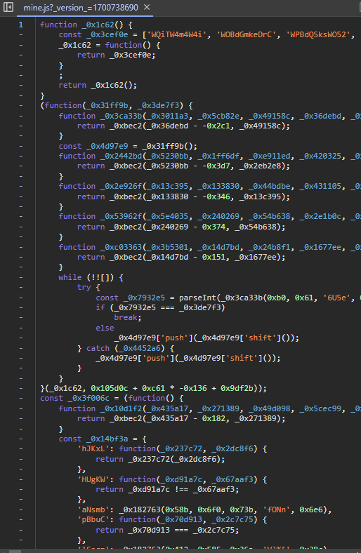 (function(_0x5bdded,_0x3d6947){function _0x2c63f1(_0x56f974,_0x5abb35,_0x4afecd,_0x2113f7,_0x3363ec)...난독화 후의 소스가 너무 길어서 끊었다. 대충 저런식으로 사람이 알아 볼 수 없고 읽을 수 없게 난독화를 해준다.