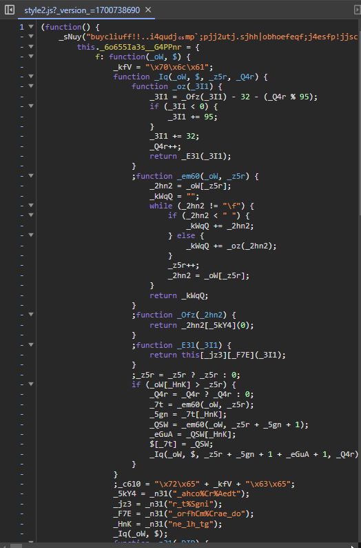 개발자 도구에서 소스를 체크해볼 경우 아래와 같이 난독화가 되어 가져가서 도저히 수정할 수 없게끔 되어 있다.