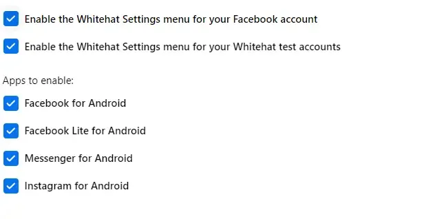 Facebook 계정의 연구자 설정에서 Whitehat 옵션을 활성화