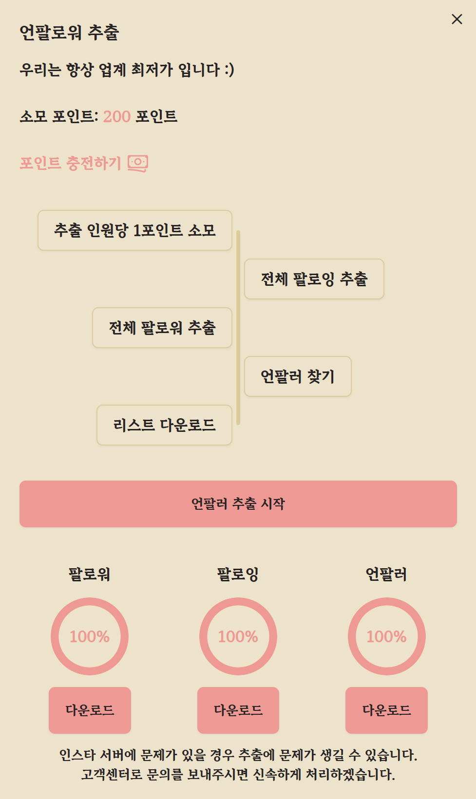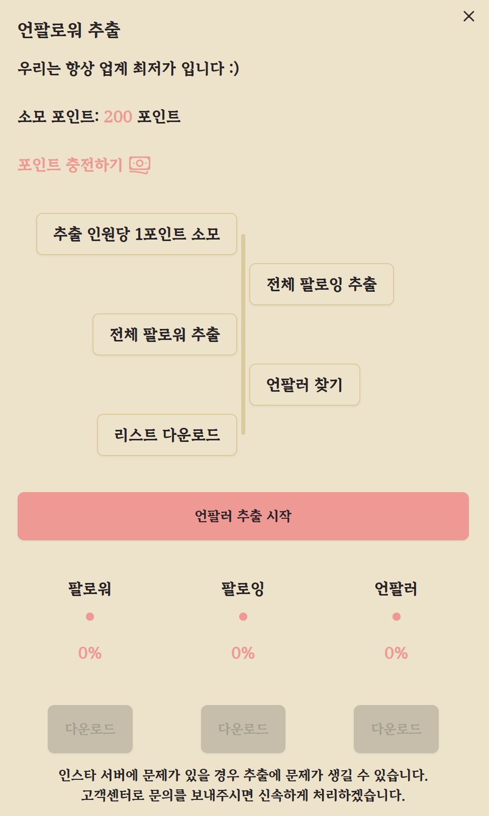 즉 인스타 로그인 없이 실시간으로 언팔로워를 추출 한다는 거죠.