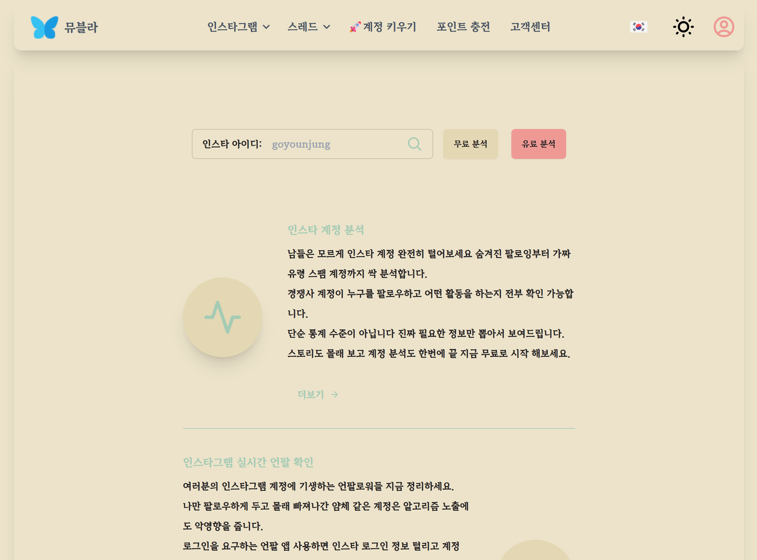 뮤블라는 인스타그램, 스레드 언팔로워(언팔러)를 확인하고 스토리 몰래보기 계정 분석 등 해킹 걱정없이 안전하게 이용 가능한 광고 없는 SNS 분석 플랫폼입니다.