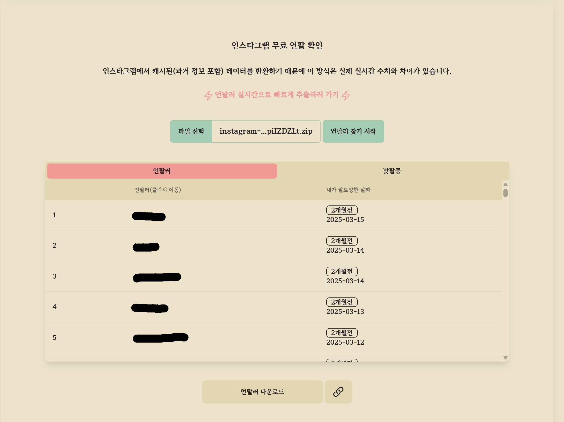 - 모든 언팔 확인 사이트들은 단순히 내 정보 다운로드 데이터를 비교할 뿐입니다. 언팔로워들을 실시간 시점으로 찾아주는게 절대 아니다.
