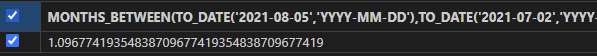 SELECT MONTHS_BETWEEN( TO_DATE('2021-08-05', 'YYYY-MM-DD'), TO_DATE('2021-07-02', 'YYYY-MM-DD') ) FROM dual;
