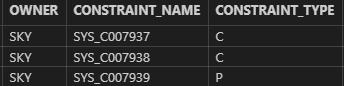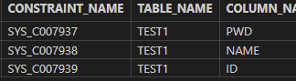 SELECT * FROM user_constraints WHERE table_name = 'TEST1'; -- 존재 유무 확인 및 P키가 있는 제약 조건 이름 확인 SELECT * FROM user_cons_columns WHERE table_name = 'TEST1';