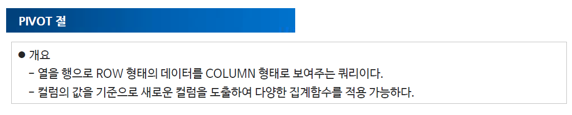 SELECT dept, city, COUNT(*) FROM emp GROUP BY dept, city ORDER BY dept; SELECT * FROM ( SELECT city, dept --열 FROM emp ) PIVOT ( COUNT(dept) -- 값 FOR dept IN ( -- 행 '개발부' AS "개발부", '영업부' AS "영업부", '기획부' AS "기획부", '인사부' AS "인사부", '자재부' AS "자재부", '총무부' AS "총무부", '홍보부' AS "홍보부" ) );UNPIVOT