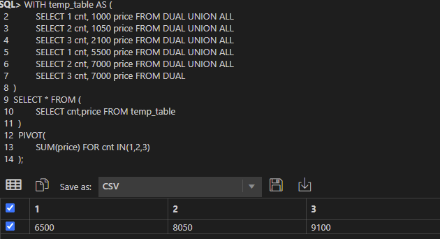 WITH temp_table AS ( SELECT 1 cnt, 1000 price FROM DUAL UNION ALL SELECT 2 cnt, 1050 price FROM DUAL UNION ALL SELECT 3 cnt, 2100 price FROM DUAL UNION ALL SELECT 1 cnt, 5500 price FROM DUAL UNION ALL SELECT 2 cnt, 7000 price FROM DUAL UNION ALL SELECT 3 cnt, 7000 price FROM DUAL ) SELECT * FROM ( SELECT cnt,price FROM temp_table ) PIVOT( SUM(price) FOR cnt IN(1,2,3) );