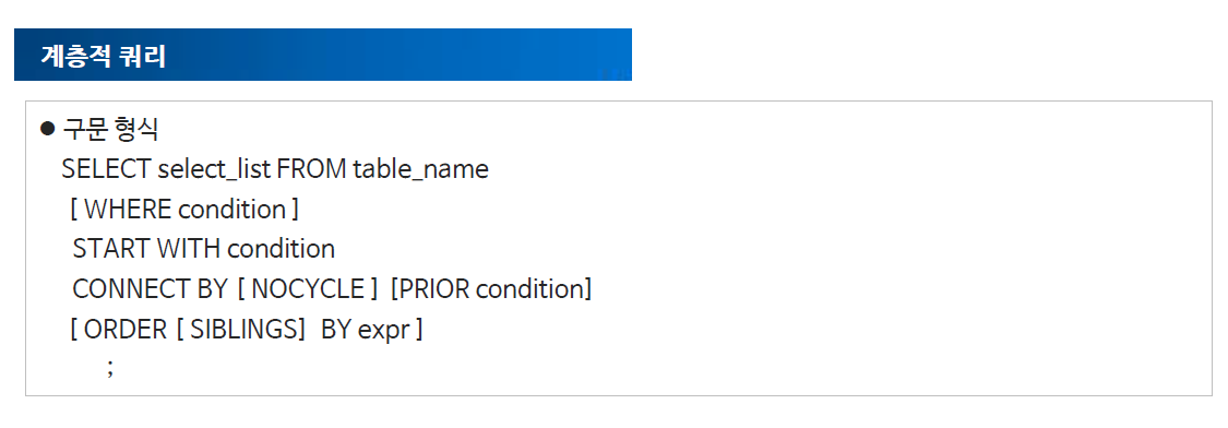 SELECT num, subject, LEVEL, parent FROM soft START WITH num = 1 -- 출력할 시작 행 CONNECT BY PRIOR num = parent; -- 계층관계 지정 -- 이전 행의 num은 parent -- 나(num)을 부모(parent)로 사용하는 행(부하 직원) 검색 -- parent 컬럼: 상위 정보를 가진 컬럼 -- LEVEL : 단계, 처음(루트)이 1단계, 하위로 갈수록 1씩 증가 -- LEVEL은 CONNECT BY 절이 있는 경우만 사용 가능SELECT num, LPAD(' ', (LEVEL-1)*4) || subject subject, LEVEL, parent FROM soft START WITH num = 1 CONNECT BY PRIOR num = parent;SELECT num, LPAD('*', (LEVEL-1)*4, '*') || subject subject, LEVEL, parent FROM soft START WITH num = 3 CONNECT BY PRIOR num = parent; -- vsCode 전용-- 계층구조를 유지하면서 같은 레벨 끼리 정렬 SELECT num, subject, LEVEL, parent FROM soft START WITH num = 1 CONNECT BY PRIOR num = parent ORDER SIBLINGS BY subject;PIVOT과 UNPIVOT