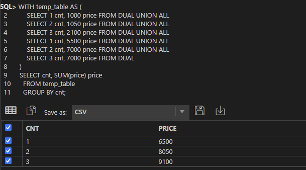 WITH temp_table AS ( SELECT 1 cnt, 1000 price FROM DUAL UNION ALL SELECT 2 cnt, 1050 price FROM DUAL UNION ALL SELECT 3 cnt, 2100 price FROM DUAL UNION ALL SELECT 1 cnt, 5500 price FROM DUAL UNION ALL SELECT 2 cnt, 7000 price FROM DUAL UNION ALL SELECT 3 cnt, 7000 price FROM DUAL ) SELECT cnt, SUM(price) price FROM temp_table GROUP BY cnt;