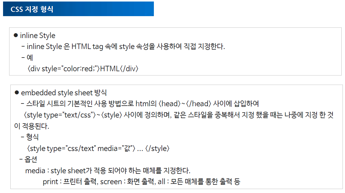 <!DOCTYPE html> <html> <head> <meta charset="UTF-8"> <title>Insert title here</title> <style type="text/css"> /* embedded style sheet */ /* 태그 선택자 */ div { color: blue; font-weight: bold;} /* id 선택자 */ #java { background: yellow;} /* class 선택자 */ .web { color: tomato; } </style> </head> <body> <h3>간단한 css 예</h3> <div>과목-프로그래밍</div> <p id="java">자바</p> <p style="font-size: 30px;">스프링</p> <hr> <div>과목-웹 프로그래밍</div> <p class="web">HTML</p> <p class="web">CSS</p> <p class="web">JavaScript</p> <hr> </body> </html>