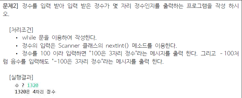 package ex0707; import java.util.Scanner; public class test03 { public static void main(String[] args) { // 응용문제 2 Scanner sc = new Scanner(System.in); int i,x; int n=0; System.out.println("정수입력"); x = i = sc.nextInt(); if(i<0) { i=i*-1; } while(i>0) { i=i/10; n++; } System.out.println(x+"은 "+n+"자리 정수"); sc.close(); } }최대 공약수 & 최소 공배수 구하기