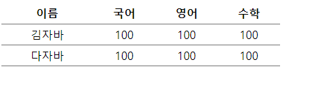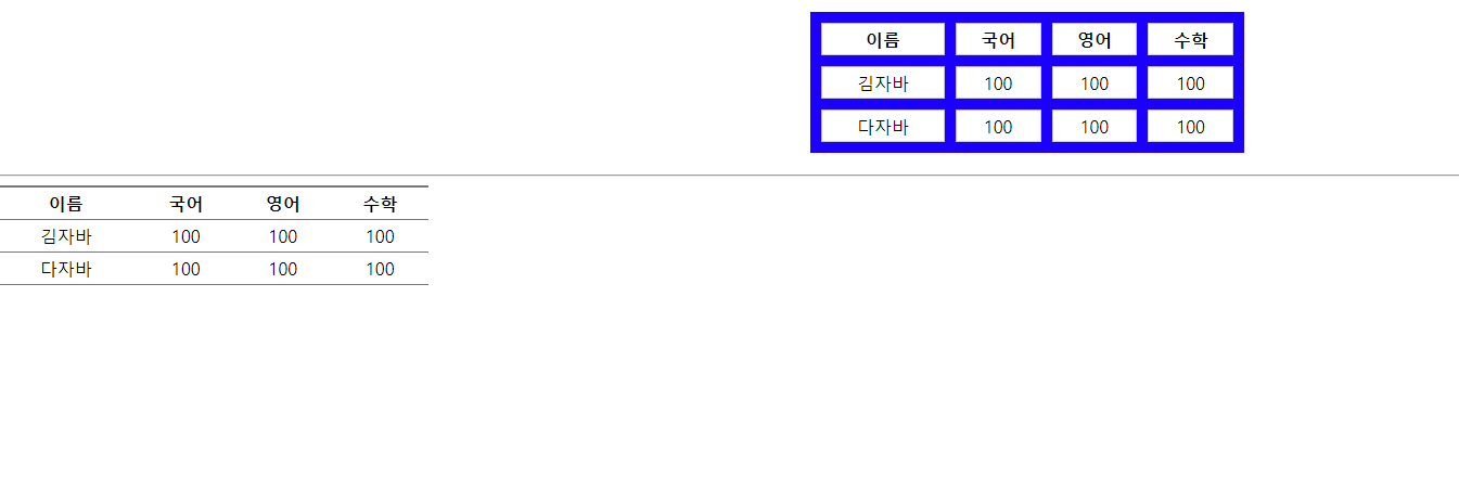 <!DOCTYPE html> <html> <head> <meta charset="UTF-8"> <title>Insert title here</title> <style type="text/css"> .score { width: 400px; margin: 20px auto; background: blue; border-spacing: 10px; } .score tr { height: 30px; text-align: center; } .score th, .score td { background: #fff; border: 1px solid #ccc; } .score2 { width: 400px; border-spacing: 0; border-collapse: collapse; /* tr도 border가 적용됨 */ } .score2 tr { height: 30px; text-align: center; border-bottom: 1px solid #777; } .score2 tr:first-child { border-top: 2px solid #777; } .score2 tr:hover { background: yellow; } </style> </head> <body> <table class="score"> <tr> <th>이름</th> <th>국어</th> <th>영어</th> <th>수학</th> </tr> <tr> <td>김자바</td> <td>100</td> <td>100</td> <td>100</td> </tr> <tr> <td>다자바</td> <td>100</td> <td>100</td> <td>100</td> </tr> </table> <hr> <table class="score2"> <tr> <th>이름</th> <th>국어</th> <th>영어</th> <th>수학</th> </tr> <tr> <td>김자바</td> <td>100</td> <td>100</td> <td>100</td> </tr> <tr> <td>다자바</td> <td>100</td> <td>100</td> <td>100</td> </tr> </table> </body> </html>