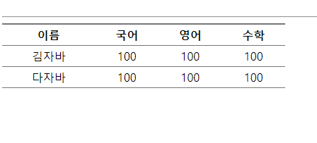<!DOCTYPE html> <html> <head> <meta charset="UTF-8"> <title>Insert title here</title> </head> <body> <h3>table 태그</h3> <table border="1" style="width: 400px; margin: 20px auto;"> <caption>성적처리</caption> <col style="background: #eee;"> <col span="3" style="background: palegreen;"> <tr> <td>이름</td> <td>국어</td> <td>영어</td> <td>수학</td> </tr> <tr> <td>홍길동</td> <td>100</td> <td>100</td> <td>100</td> </tr> <tr> <td>김자바</td> <td>100</td> <td>100</td> <td>100</td> </tr> </table> <hr> <table border="1" style="width: 400px; margin: 20px auto;"> <caption>성적처리</caption> <colgroup> <col width="40%"> <col width="20%"> <col width="20%"> <col width="20%"> </colgroup> <tr> <td>이름</td> <td>국어</td> <td>영어</td> <td>수학</td> </tr> <tr> <td>홍길동</td> <td>100</td> <td>100</td> <td>100</td> </tr> <tr> <td>김자바</td> <td>100</td> <td>100</td> <td>100</td> </tr> </table> <br> </body> </html>