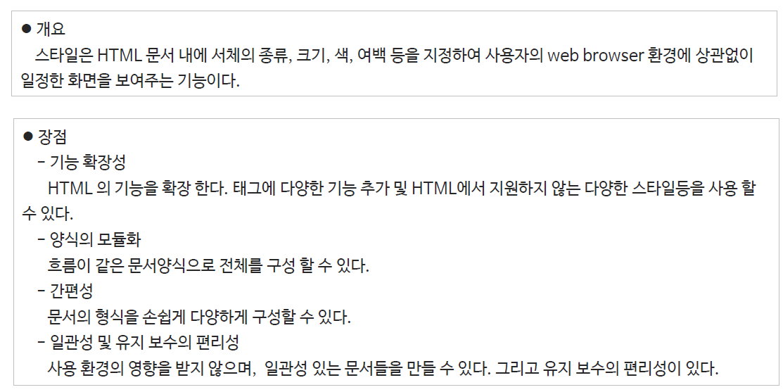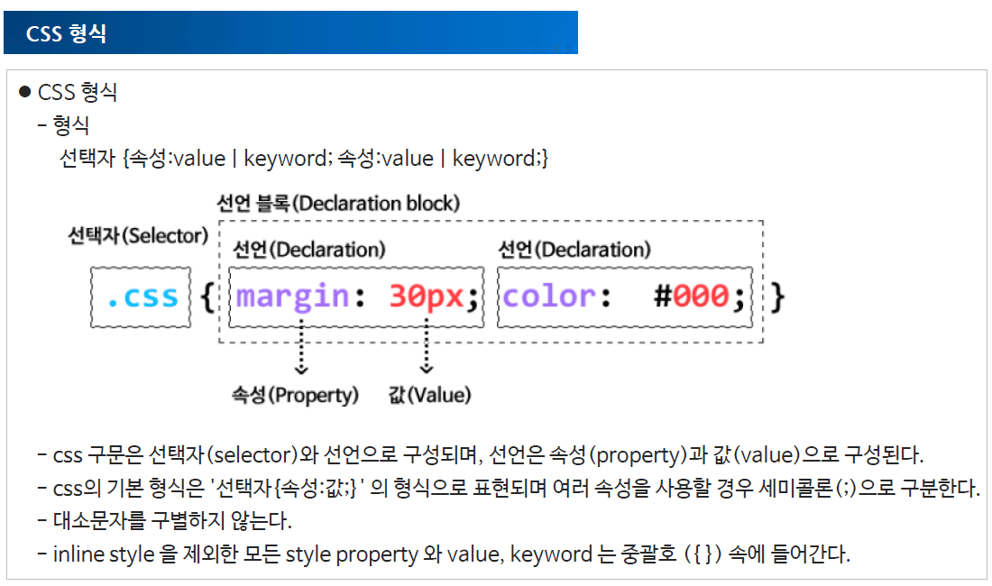 - 글자들 사이 공백을 주거나 색깔 밑줄 폰트 글자 크기 태그들의 배치 등등 이런 것들을 전부 CSS라고 한다.