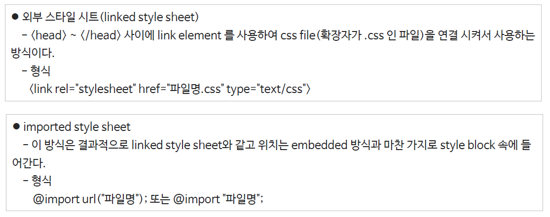 - 외부 link를 이용해서 css파일을 가져오는 방법이다.