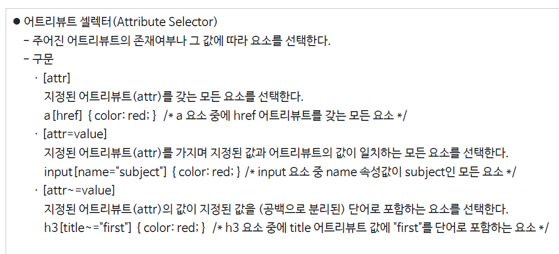 input[title~="내용"] = title 애들 중에서 "내용" 이라는 단어가 포함된 애들한테 적용 하겠다.
