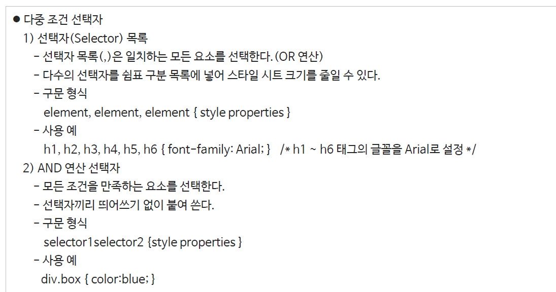 AND 선택자 = div.box{} div태그의 box 클래스만 적용