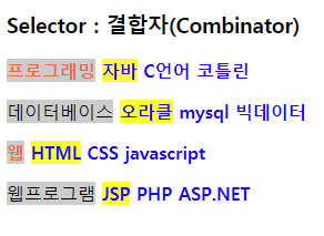 <!DOCTYPE html> <html> <head> <meta charset="UTF-8"> <title>Insert title here</title> <style type="text/css"> /* 인접 형제 결합자(+) */ label + span { background: yellow; } /* 일반 형제 결합자(~) */ label ~ span { color: blue; font-weight: 600; } /* 자식 결합자(>) */ .subject > label { color:tomato; font-weight: bold; } /* 자손(후손) 결합자(공백) */ .subject label { background: #ccc; } </style> </head> <body> <h3>Selector : 결합자(Combinator)</h3> <div class="box"> <div class="subject"> <label>프로그래밍</label> <span>자바</span> <span>C언어</span> <span>코틀린</span> <p> <label>데이터베이스</label> <span>오라클</span> <span>mysql</span> <span>빅데이터</span> </p> </div> <div class="subject"> <label>웹</label> <span>HTML</span> <span>CSS</span> <span>javascript</span> <p> <label>웹프로그램</label> <span>JSP</span> <span>PHP</span> <span>ASP.NET</span> </p> </div> </div> </body> </html>