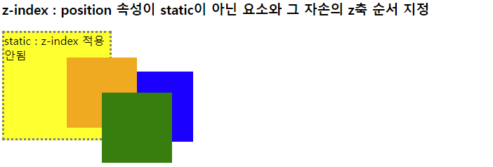 <!DOCTYPE html> <html> <head> <meta charset="UTF-8"> <title>Insert title here</title> <style type="text/css"> .box { width: 150px; height: 150px; border: 3px dotted gray; } .absolute-box { width: 100px; height: 100px; position: absolute; } .yellow { background: yellow; z-index: 1000; } .orange { background: orange; left: 100px; top:100px; z-index: 100; } .green { background: green; left: 150px; top:150px; z-index: 500; } .blue{ background: blue; left: 180px; top: 120px; z-index: 10; } </style> </head> <body> <h3> z-index : position 속성이 static이 아닌 요소와 그 자손의 z축 순서 지정 </h3> <div class="box yellow">static:z-index 적용안됨</div> <div class="absolute-box orange"></div> <div class="absolute-box green"></div> <div class="absolute-box blue"></div> </body> </html>