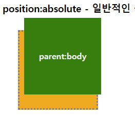<!DOCTYPE html> <html> <head> <meta charset="UTF-8"> <title>Insert title here</title> <style type="text/css"> .box{ width: 150px; height: 150px; margin: 30px; border: 3px dotted gray; background: orange; } .default-box{ background: #333; color: #eee; font-weight: bold; text-align: center; line-height: 150px; } .absolute-box{ position: absolute; width: 150px; height: 150px; left: 50px; top: 50px; background: green; color: #eee; font-weight: bold; text-align: center; line-height: 150px; } </style> </head> <body> <h3>position:absolute - 일반적인 문서 흐름을 따르지 않으며, 페이지 레이아웃에 공간도 배정하지 않음.</h3> <div class="box"> <div class="absolute-box">parent:div</div> </div> <div class="absolute-box">parent:body</div> </body> </html>