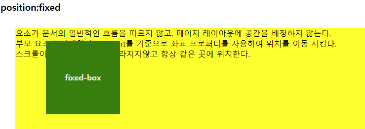 <!DOCTYPE html> <html> <head> <meta charset="UTF-8"> <title>Insert title here</title> <style type="text/css"> .box{ width: 100%; height: 2500px; background: yellow; } .fixed-box { position: fixed; width: 150px; height: 150px; left: 100px; top: 100px; background: green; color: #eee; font-weight: bold; text-align: center; line-height: 150px; } </style> </head> <body> <h3>position:fixed</h3> <div class="box"> 요소가 문서의 일반적인 흐름을 따르지 않고, 페이지 레이아웃에 공간을 배정하지 않는다.<br> 부모 요소와 관계없이 viewport를 기준으로 좌표 프로퍼티을 사용하여 위치를 이동 시킨다.<br> 스크롤이 되더라도 화면에 사라 지지않고 항상 같은 곳에 위치한다. </div> <div class="fixed-box">fixed-box</div> </body> </html>