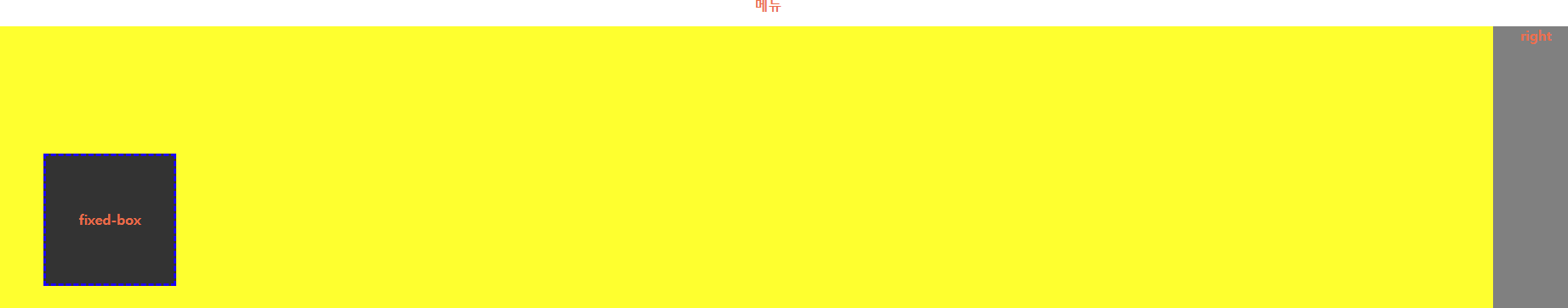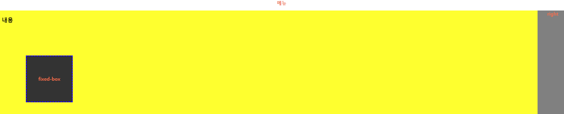 <!DOCTYPE html> <html> <head> <meta charset="UTF-8"> <title>Insert title here</title> <style type="text/css"> *{ padding: 0; margin: 0; } .container { width: 100%; height: 1500px; background: yellow; } .container-body { position: relative; left: 0; top:50px; padding: 20px; z-index: 10; } .fixed-box { position: fixed; color: tomato; font-weight: bold; text-align: center; background: #333; } .nav { width: 100%; height: 50px; top:0; left: 0; line-height: 50px; z-index: 9999; /* 화면이 스크롤되어도 메뉴자리에 내용이 보이지 않게 하기 위해 */ } .right{ width: 100px; height: 100%; top:50px; right: 0; background: gray; } .box{ width: 150px; height: 150px; left: 100px; top:200px; border: 3px dashed blue; line-height: 150px; } </style> </head> <body> <div class="container"> <div class="nav fixed-box" style="background: white;">메뉴</div> <div class="container-body"> <h3>내용</h3> </div> </div> <div class="box fixed-box">fixed-box</div> <div class="right fixed-box">right</div> </body> </html>