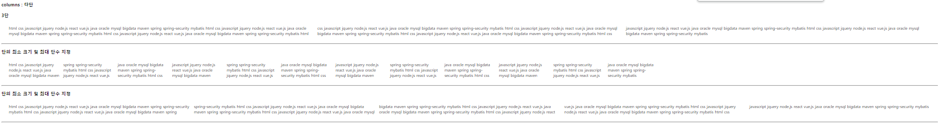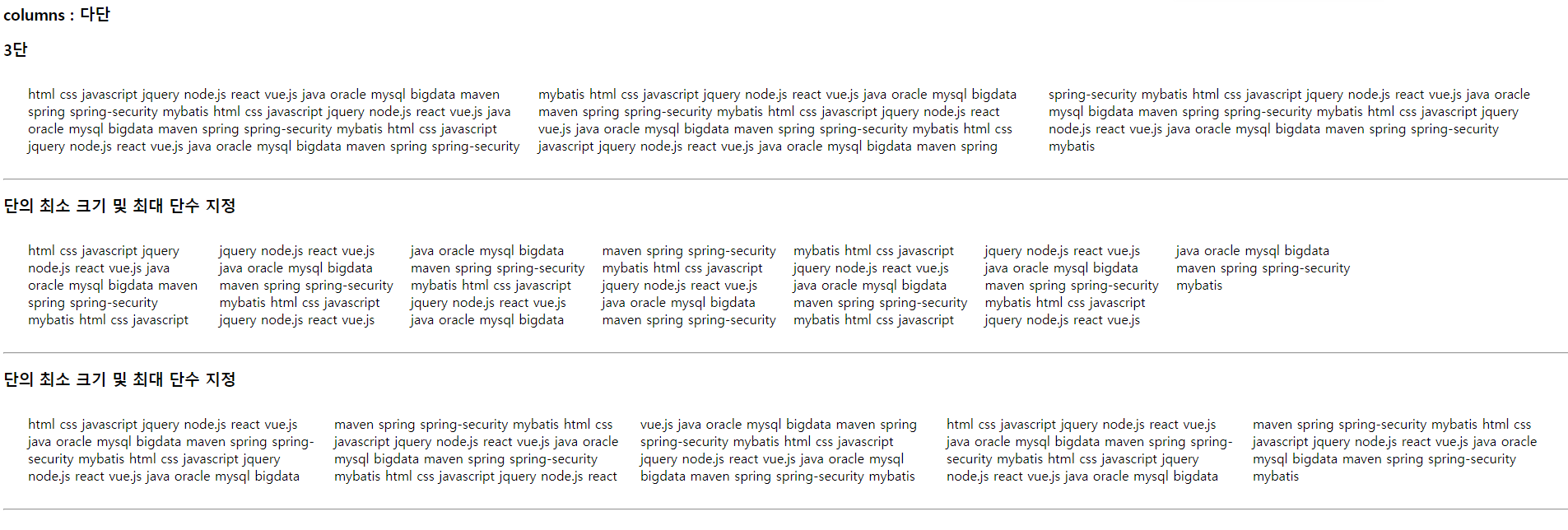 <!DOCTYPE html> <html> <head> <meta charset="UTF-8"> <title>Insert title here</title> <style type="text/css"> .box1 { columns: 3; /* 3단*/ margin: 30px; } .box2 { columns: 200px; /* 단의 최소 크기 */ margin: 30px; } .box3 { columns: 200px 5; /* 단의 최소 크기 및 단의 최대 개수 */ margin: 30px; } </style> </head> <body> <h3>columns : 다단</h3> <h3>3단</h3> <div class="box1"> html css javascript jquery node.js react vue.js java oracle mysql bigdata maven spring spring-security mybatis html css javascript jquery node.js react vue.js java oracle mysql bigdata maven spring spring-security mybatis html css javascript jquery node.js react vue.js java oracle mysql bigdata maven spring spring-security mybatis html css javascript jquery node.js react vue.js java oracle mysql bigdata maven spring spring-security mybatis html css javascript jquery node.js react vue.js java oracle mysql bigdata maven spring spring-security mybatis html css javascript jquery node.js react vue.js java oracle mysql bigdata maven spring spring-security mybatis html css javascript jquery node.js react vue.js java oracle mysql bigdata maven spring spring-security mybatis html css javascript jquery node.js react vue.js java oracle mysql bigdata maven spring spring-security mybatis </div> <hr> <h3>단의 최소 크기 지정</h3> <div class="box2"> html css javascript jquery node.js react vue.js java oracle mysql bigdata maven spring spring-security mybatis html css javascript jquery node.js react vue.js java oracle mysql bigdata maven spring spring-security mybatis html css javascript jquery node.js react vue.js java oracle mysql bigdata maven spring spring-security mybatis html css javascript jquery node.js react vue.js java oracle mysql bigdata maven spring spring-security mybatis html css javascript jquery node.js react vue.js java oracle mysql bigdata maven spring spring-security mybatis html css javascript jquery node.js react vue.js java oracle mysql bigdata maven spring spring-security mybatis html css javascript jquery node.js react vue.js java oracle mysql bigdata maven spring spring-security mybatis html css javascript jquery node.js react vue.js java oracle mysql bigdata maven spring spring-security mybatis </div> <hr> <h3>단의 최소 크기 및 최대 단수 지정</h3> <div class="box3"> html css javascript jquery node.js react vue.js java oracle mysql bigdata maven spring spring-security mybatis html css javascript jquery node.js react vue.js java oracle mysql bigdata maven spring spring-security mybatis html css javascript jquery node.js react vue.js java oracle mysql bigdata maven spring spring-security mybatis html css javascript jquery node.js react vue.js java oracle mysql bigdata maven spring spring-security mybatis html css javascript jquery node.js react vue.js java oracle mysql bigdata maven spring spring-security mybatis html css javascript jquery node.js react vue.js java oracle mysql bigdata maven spring spring-security mybatis html css javascript jquery node.js react vue.js java oracle mysql bigdata maven spring spring-security mybatis html css javascript jquery node.js react vue.js java oracle mysql bigdata maven spring spring-security mybatis </div> <hr> </body> </html>