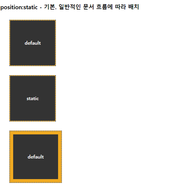 .box{ width: 150px; height: 150px; margin: 30px; border: 3px dotted gray; background: orange; } .default-box{ background: #333; color: #eee; font-weight: bold; text-align: center; line-height: 150px; } .static-box{ position: static; background: #333; color: #eee; font-weight: bold; text-align: center; line-height: 150px; }