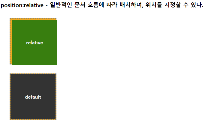 <!DOCTYPE html> <html> <head> <meta charset="UTF-8"> <title>Insert title here</title> <style type="text/css"> .box{ width: 150px; height: 150px; margin: 30px; border: 3px dotted gray; background: orange; } .default-box{ background: #333; color: #eee; font-weight: bold; text-align: center; line-height: 150px; } .relative-box{ position: relative; left: 5px; top: 5px; background: green; color: #eee; font-weight: bold; text-align: center; line-height: 150px; } </style> </head> <body> <h3>position:relative - 일반적인 문서 흐름에 따라 배치하며, 위치를 지정할 수 있다.</h3> <div class="box"> <div class="relative-box">relative</div> </div> <div class="box"> <div class="default-box">default</div> </div> </body> </html>