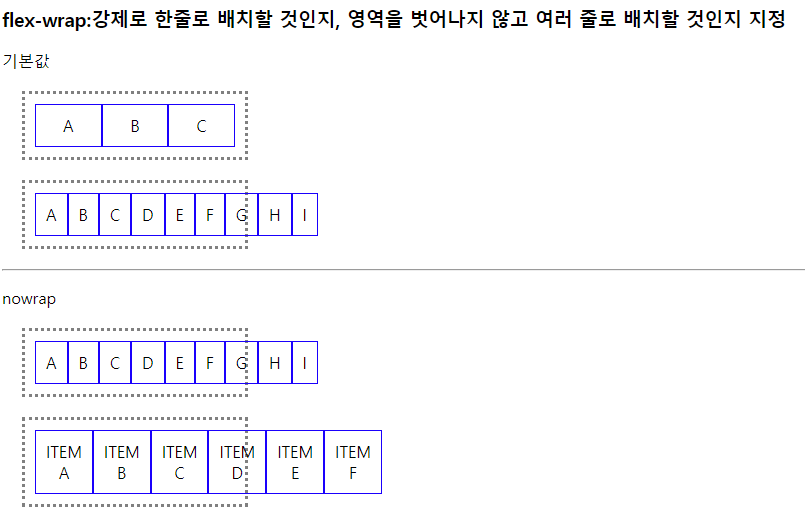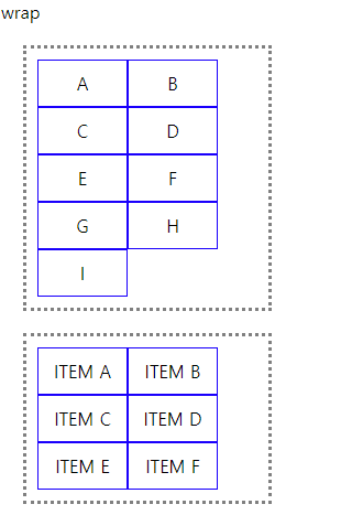 <!DOCTYPE html> <html> <head> <meta charset="UTF-8"> <title>Insert title here</title> <style type="text/css"> .flex-container { width: 200px; padding: 10px; margin: 20px; border: 3px dotted gray; display: flex; } .nowrap { flex-wrap: nowrap; } .wrap { flex-wrap: wrap; } .box{ width: 60px; height: 100%; padding: 10px; text-align: center; border: 1px solid blue; } </style> </head> <body> <h3>flex-wrap:강제로 한줄로 배치할 것인지, 영역을 벗어나지 않고 여러 줄로 배치할 것인지 지정</h3> <p>기본값</p> <div class="flex-container"> <div class="box">A</div> <div class="box">B</div> <div class="box">C</div> </div> <div class="flex-container"> <div class="box">A</div> <div class="box">B</div> <div class="box">C</div> <div class="box">D</div> <div class="box">E</div> <div class="box">F</div> <div class="box">G</div> <div class="box">H</div> <div class="box">I</div> </div> <hr> <p>nowrap</p> <div class="flex-container nowrap"> <div class="box">A</div> <div class="box">B</div> <div class="box">C</div> <div class="box">D</div> <div class="box">E</div> <div class="box">F</div> <div class="box">G</div> <div class="box">H</div> <div class="box">I</div> </div> <div class="flex-container nowrap"> <div class="box">ITEM A</div> <div class="box">ITEM B</div> <div class="box">ITEM C</div> <div class="box">ITEM D</div> <div class="box">ITEM E</div> <div class="box">ITEM F</div> </div> <hr> <p>wrap</p> <div class="flex-container wrap"> <div class="box">A</div> <div class="box">B</div> <div class="box">C</div> <div class="box">D</div> <div class="box">E</div> <div class="box">F</div> <div class="box">G</div> <div class="box">H</div> <div class="box">I</div> </div> <div class="flex-container wrap"> <div class="box">ITEM A</div> <div class="box">ITEM B</div> <div class="box">ITEM C</div> <div class="box">ITEM D</div> <div class="box">ITEM E</div> <div class="box">ITEM F</div> </div> <hr> </body> </html>