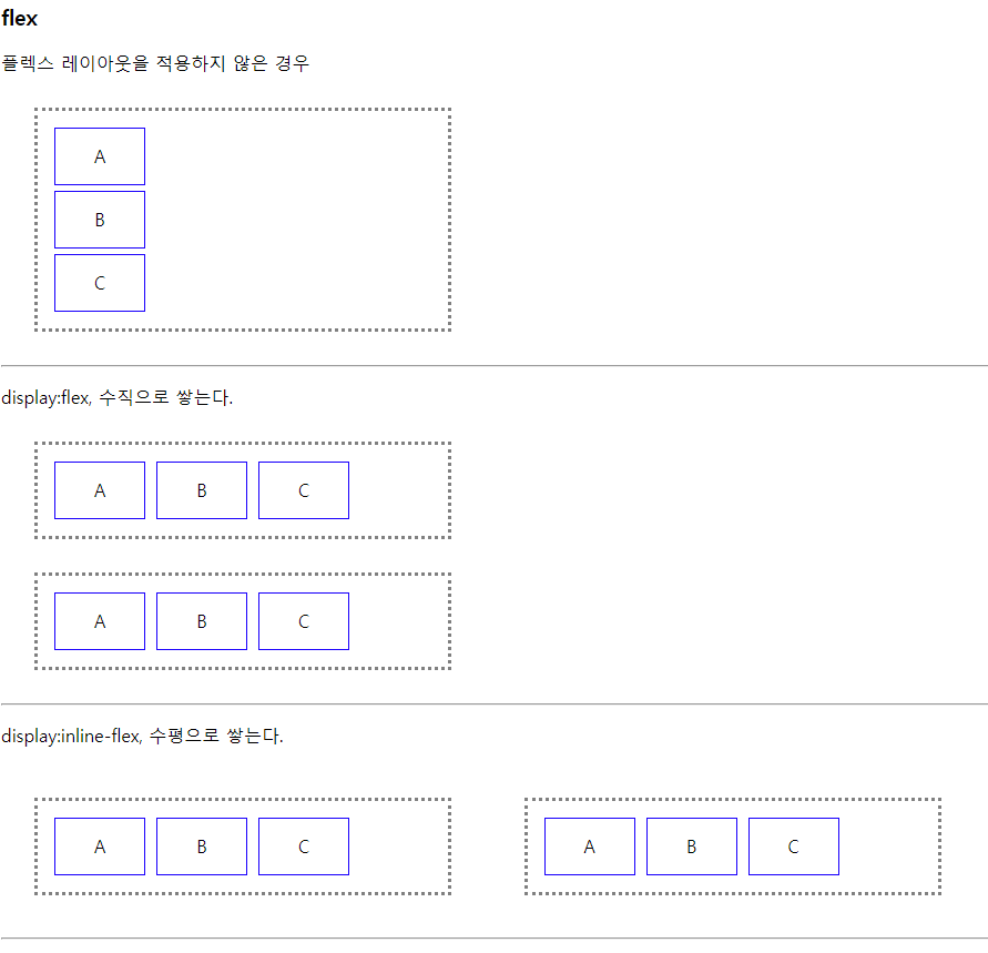<!DOCTYPE html> <html> <head> <meta charset="UTF-8"> <title>Insert title here</title> <style type="text/css"> .flex-container { width: 350px; padding: 10px; margin: 30px; border: 3px dotted gray; } .flex { display: flex; } .inline-flex { display: inline-flex; } .box{ width: 80px; height: 50px; line-height: 50px; text-align: center; margin: 5px; border: 1px solid blue; } </style> </head> <body> <h3>flex</h3> <p>플렉스 레이아웃을 적용하지 않은 경우</p> <div class="flex-container"> <div class="box">A</div> <div class="box">B</div> <div class="box">C</div> </div> <hr> <p>display:flex, 수직으로 쌓는다.</p> <div class="flex-container flex"> <div class="box">A</div> <div class="box">B</div> <div class="box">C</div> </div> <div class="flex-container flex"> <div class="box">A</div> <div class="box">B</div> <div class="box">C</div> </div> <hr> <p>display:inline-flex, 수평으로 쌓는다.</p> <div class="flex-container inline-flex"> <div class="box">A</div> <div class="box">B</div> <div class="box">C</div> </div> <div class="flex-container inline-flex"> <div class="box">A</div> <div class="box">B</div> <div class="box">C</div> </div> <hr> </body> </html>