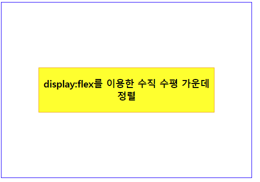 <!DOCTYPE html> <html> <head> <meta charset="UTF-8"> <title>Insert title here</title> <style type="text/css"> .parent { width: 500px; height: 350px; border: 1px solid blue; display: flex; align-items: center; /* 수직 가운데. display: flex 에서 가능 */ justify-content: center; /* 주축 정렬. display: flex 에서 가능 */ } .box { width: 350px; border: 1px solid orange; background: yellow; } h3 { text-align: center; } </style> </head> <body> <div class="parent"> <div class="box"> <h3>display:flex를 이용한 수직 수평 가운데 정렬</h3> </div> </div> </body> </html>