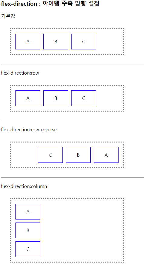 <!DOCTYPE html> <html> <head> <meta charset="UTF-8"> <title>Insert title here</title> <style type="text/css"> .flex-container { width: 350px; padding: 10px; margin: 30px; border: 3px dotted gray; display: flex; } .row { flex-direction: row; } .row-reverse { flex-direction: row-reverse; } .column { flex-direction: column; } .column-reverse { flex-direction: column-reverse; } .box{ width: 80px; height: 50px; line-height: 50px; text-align: center; margin: 5px; border: 1px solid blue; } </style> </head> <body> <h3>flex-direction : 아이템 주측 방향 설정</h3> <p>기본값</p> <div class="flex-container"> <div class="box">A</div> <div class="box">B</div> <div class="box">C</div> </div> <hr> <p>flex-direction:row</p> <div class="flex-container row"> <div class="box">A</div> <div class="box">B</div> <div class="box">C</div> </div> <hr> <p>flex-direction:row-reverse</p> <div class="flex-container row-reverse"> <div class="box">A</div> <div class="box">B</div> <div class="box">C</div> </div> <hr> <p>flex-direction:column</p> <div class="flex-container column"> <div class="box">A</div> <div class="box">B</div> <div class="box">C</div> </div> <hr> <p>flex-direction:column-reverse</p> <div class="flex-container column-reverse"> <div class="box">A</div> <div class="box">B</div> <div class="box">C</div> </div> </body> </html>