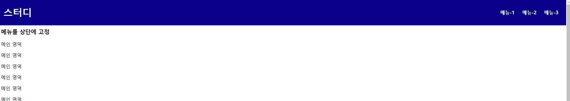 <!DOCTYPE html> <html> <head> <meta charset="UTF-8"> <title>Insert title here</title> <style type="text/css"> header { height: 55px; padding: 1rem; color: white; background: darkblue; font-weight: bold; display: flex; justify-content: space-between; align-items: center; position: fixed; top: 0; left:0; right:0; } nav > span { cursor: pointer; padding: 10px; } main { min-height: 1100px; padding-top: 70px; } footer { height: 50px; line-height: 50px; text-align: center; } </style> </head> <body> <header> <h1>스터디</h1> <nav> <span>메뉴-1</span> <span>메뉴-2</span> <span>메뉴-3</span> </nav> </header> <main> <h3>메뉴를 상단에 고정</h3> <p>메인 영역</p> <p>메인 영역</p> <p>메인 영역</p> <p>메인 영역</p> <p>메인 영역</p> <p>메인 영역</p> </main> <footer> <p>푸터 영역</p> </footer> </body> </html>